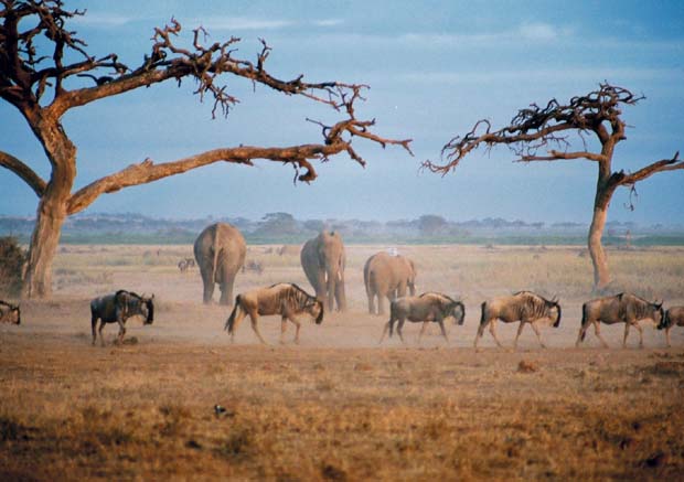 サバンナの大地を移動するヌーの群、二本の木がここの気候の厳しさを教えてくれています。