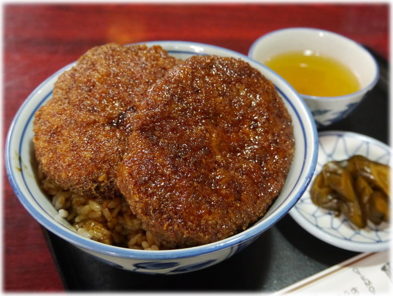 | カツが1枚エビが1枚のミンチカツ1枚のトリオ丼をどうぞ!エビがお口の中をミンチカツのジューシーさと海老のアッサリ感がベストマッチです! | カラッと揚がったサクサク衣のミンチカツ!パリッと食べて中身はジューシー、特製ウスターソースが絡まって抜群の美味しさです。この食感、一度味わってみて下さい。 |